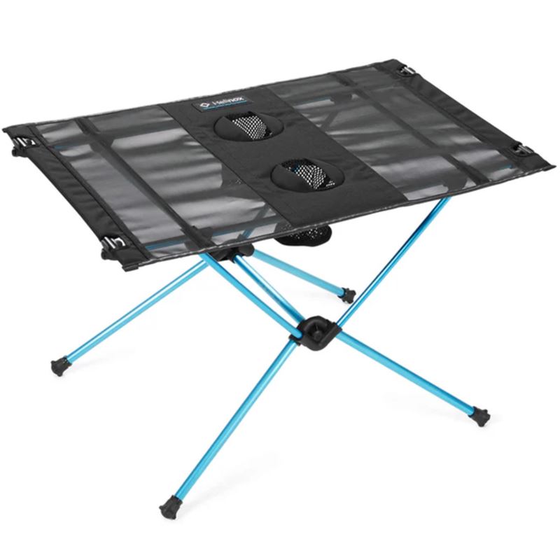 Expertly portable and perfectly sized for our Helinox chairs, the Table One has integrated mesh cup holders and a stable surface area for plates of food or game of cards. Compact, collapsible frame and foldable tabletop. Packs into a 16.5″ x 4.5″ x 4.5″ three-quarter zip cylinder case that has a daisy chain and webbing handle.